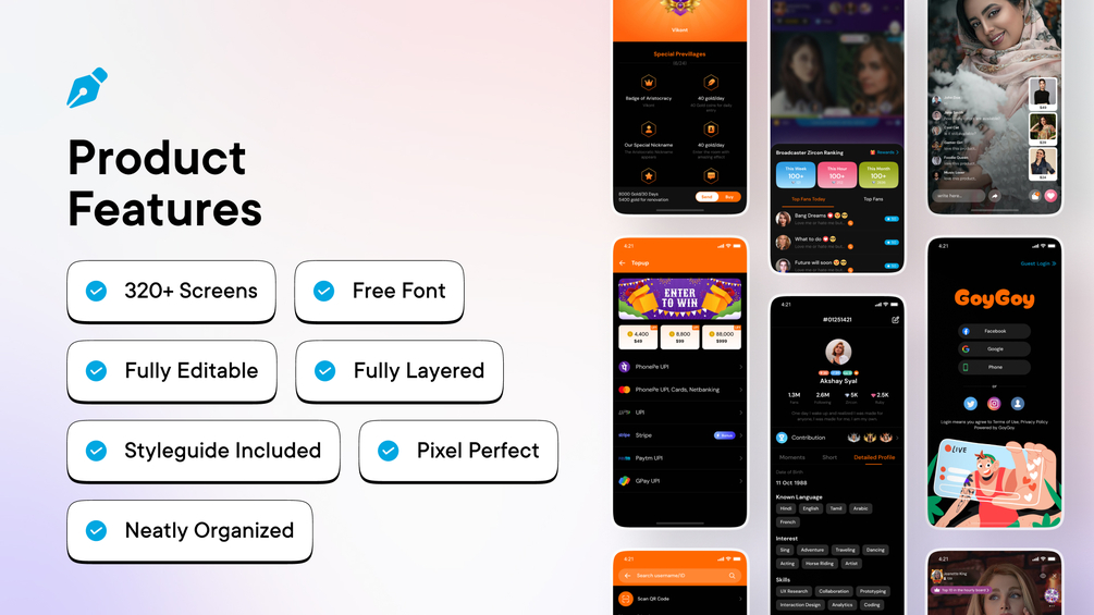 If you're designing a live streaming app similar to Bigo Live or Tango Live, this UI kit is a perfect match for your requirements.