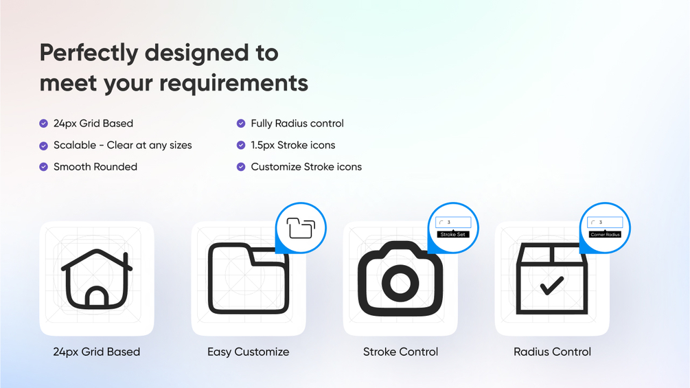 Qty: 1500+ fully editable rounded Line icons for professional web and mobile interfaces. Our Icon library is designed in a 24px × 24px frame with 5px of padding. They are sharp, catchy, and ready to scale up to any size.