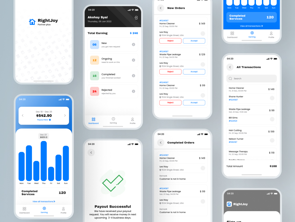 RightJoy - Service Booking UI Kit by Xnix Pro is a high-quality premium pack, including 25 screens for the User side panel and 21 screens for the Service/Partner side panel of your next Online Service Booking Project. We continue to add new things to make our template more beautiful and strong every day. This UI kit is ready to use for your next project!